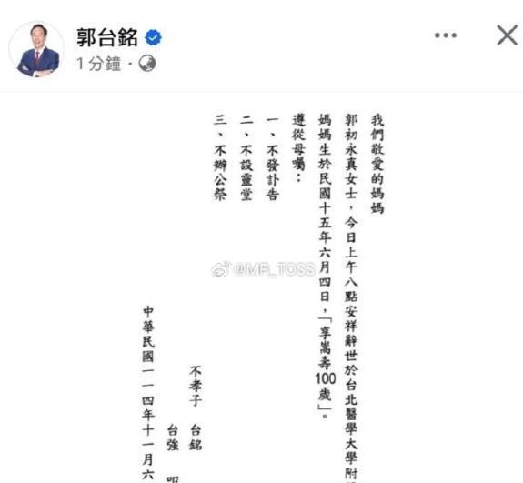 [免责声明]文章的时间、过程、图片均来自于网络,文章旨在传播正能量,均无低俗等不良引导,请观众勿对号入座,并上升到人身攻击等方面。观众理性看待本事件,切勿留下主观臆断的恶意评论,互联网不是法外之地。本文如若真实性存在争议、事件版权或图片侵权问题,请及时联系作者,我们将予以删除。信息来源:百度百科:郭葆华、郭台铭、张柔武、刘大刚痛心!戏曲泰斗陨落…….西安晚报官方账号.郭台铭母亲辞世,“没有妈妈给万新台币就没有鸿海”.海峡导报.张謇先生嫡孙女张柔武逝世,享岁.北京日报客户端.“沙僧”刘大刚已火化并下葬!“猪八戒”马德华悼念:挺好的一兄弟,走了.搜狐娱乐.